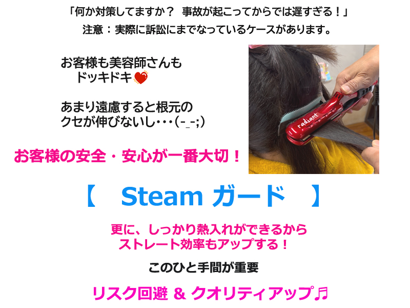 経験が浅いスタッフに任せる時や、水蒸気が当たりやすいネープ付近や耳回りだけ使用するなど、お客様の安全を確保することは大切ではないでしょうか!?